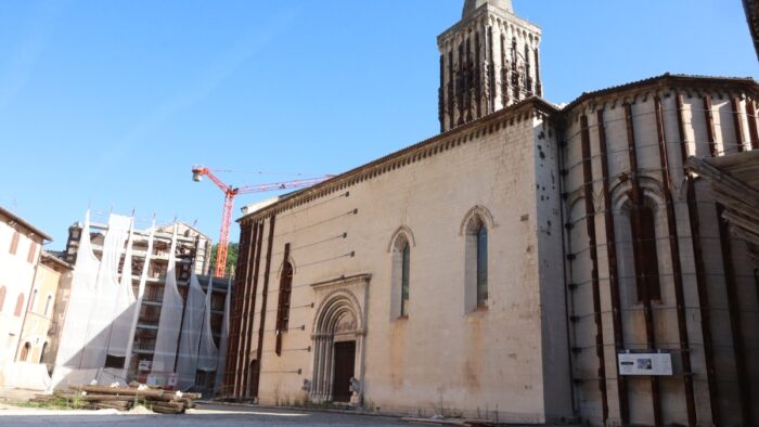 Visso, piazza dei Martiri vissani nel centro storico; a destra la Collegiata, a sinistra dietro i teli Sant’Agostino, fine agosto 2025. Foto Stefano Miliani