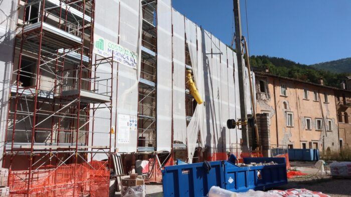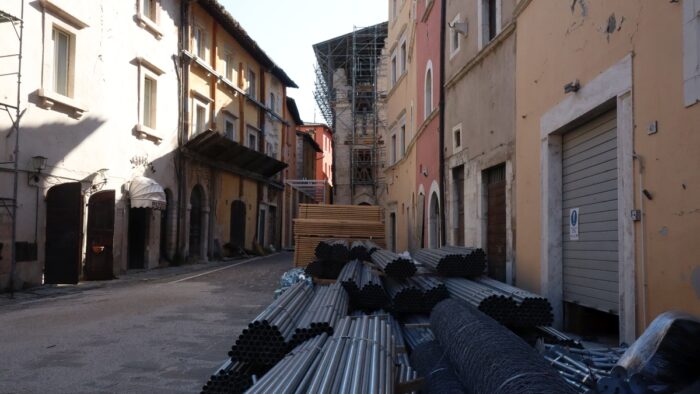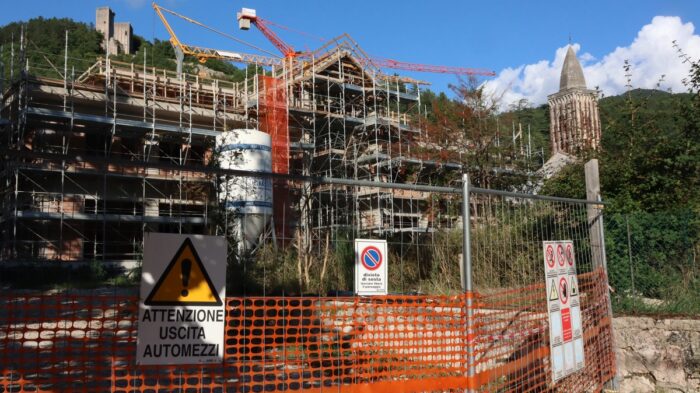 Cantieri in corso presso il centro storico a Visso, fine agosto 2025. Foto Stefano Miliani