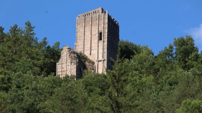 La torre sopra il nucleo antico di Visso, fine agosto 2025. Foto Stefano Miliani