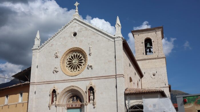 D’impianto medioevale a partire da metà del ‘300, era stata rimaneggiata pesantemente nei secoli in seguito a terremoti e con un interno in prevalenza settecentesco. Con il cantiere iniziato a fine 2021, la basilica è di nuovo integra. I tecnici avevano l’obbligo, fissato da una commissione ministeriale presieduta da Antonio Paolucci, di ricomporre l’aspetto precedente e, al contempo, di rendere la struttura molto più resistente a futuri terremoti tramite mezzi tecnici innovativi e usando sia tecniche nuove che antiche. Riutilizzando per esempio tutte le cinquemila pietre recuperate e catalogate una a una.
