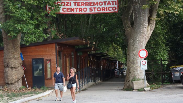 I negozi di Norcia nelle strutture prefabbricate fuori dalle mura presso Porta ascolana a fine agosto 2025. Foto Stefano Miliani