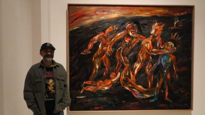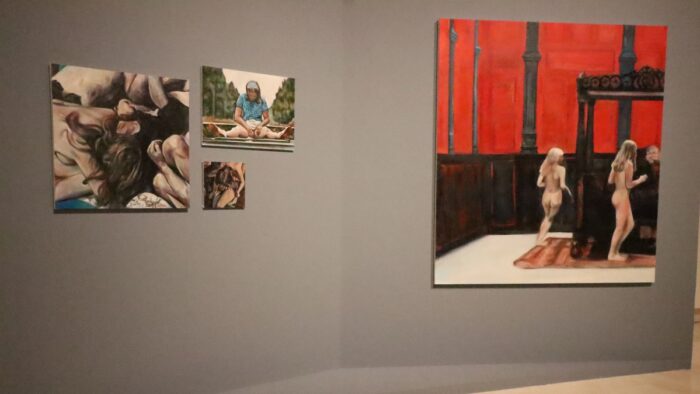 A piano terra si vedono 187 opere di 54 artiste e artisti italiani nati tra gli anni ’60 e la fine degli anni ’90; 45 debuttano alla “Quadriennale”, sedici sono under 35. Qual è il risultato complessivo? Eterogeneo, con una discreta quantità di dipinti, senza una direzione prevalente, un movimento che si impone su altri. Forse tanta eterogeneità di forme e linguaggi denota quella frammentazione sociale e culturale dell’epoca dell’isolamento camuffato dei social. Salvo i video in paesi africani di Massimo Grimaldi, o le foto di Andrea Camiolo ricreate con l’intelligenza artificiale intorno al “Manhattan Procjet” statunitense per l’atomica, risalta l’assenza di chi, attraverso la propria opera, richiama temi controversi affini alla politica come, per dire, la migrazione, il razzismo, la povertà, l’identità sessuale, il patriarcato, le guerre.