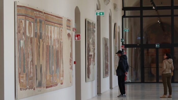 Nel loggiato è notevole la sfilata di affreschi staccati dal primo ‘200 al ‘500. Arricchisce il tutto, vicino alle scale, un intrigante e istruttivo “touch wall” interattivo, chiamato “Iride”: lungo 3,5 metri, permette di scoprire storie e dettagli di opere di andar per temi (per esempio quali raffigurano angeli e demoni) e, possiamo assicurarlo, funziona egregiamente.