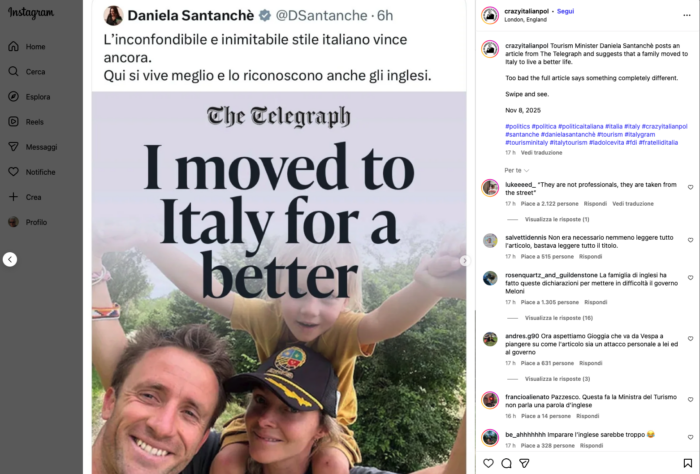 “Qui si vive meglio e lo riconoscono anche gli inglesi”. Con queste parole, travolta da un eccesso di entusiasmo patriottico, la ministra del Turismo Daniela Santanché, ha deciso di rilanciare su X un articolo del The Telegraph dal titolo “I moved to Italy for a better life…”.