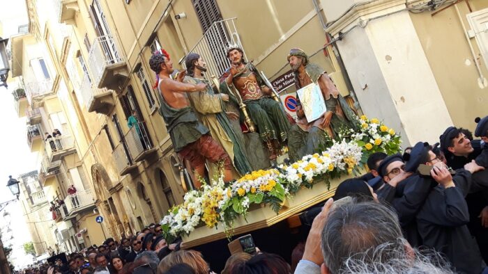 Leonardo Sciascia, isolano fin dentro l’anima, lo aveva colto nella “Corda pazza”, dove scriveva che in Sicilia, queste feste, erano “tutto”, un’esplosione esistenziale collettiva il cui confine “non poteva essere segnato in alcun modo dal perimetro religioso”.  Questa verità si riscontra appieno nei “Misteri” che si celebrano a Trapani: possenti sculture della Passione, portate a spalla dai peccatori, che sono accompagnate da bande musicali e da un popolo ora triste ora festoso. Si muovono il primo pomeriggio del venerdì e finiscono il Sabato Santo.