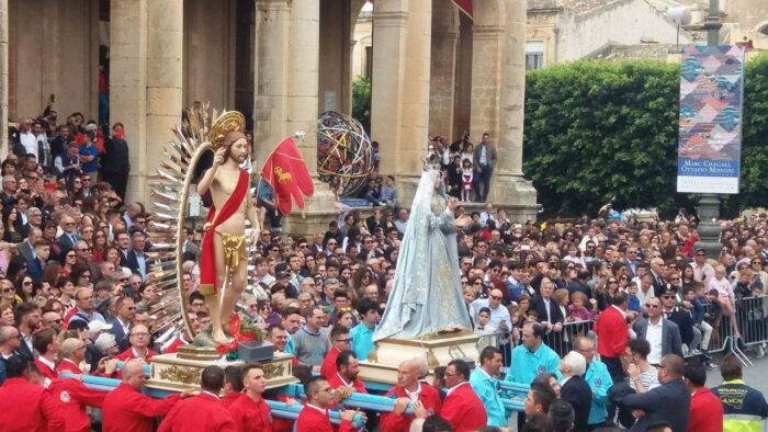 Questa gioia preparata, attesa, come s’attende la primavera, esplode poi la Domenica mattina quando si celebrano alcuni dei riti più affascinanti: la “A Maronna Vasa Vasa” a Modica che è del tutto simile a quella che svolge ad Aragona, “L’incontro pasquale”, dove il nome del rito cambia mantenendo la stessa sostanza: la Madonna che piangendo corre incontro per una, due, tre volte al Figlio e, solo al terzo bacio, il velo nero della morte cade a terra in mezzo all’esplosione di gioia del paese.